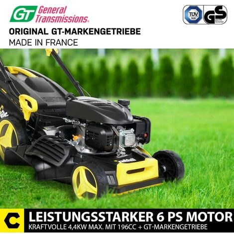 Das GT-Leichtlaufgetriebe mit dem leistungsstarken Selbstantrieb (196cc OHV Motor 4,4 KW) sorgt effizient für gleichmäßige Leistung des Craftfull Benzin Rasenmähers. Dank der Easy Start Funktion durch Primerpumpe kommt dieser Motorrasenmäher schnell in Fahrt. Ein wahres Kraftpaket unter den Benzinrasenmähern mit Antrieb, das sich mit dem hohen Griff leicht manövrieren lässt.