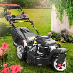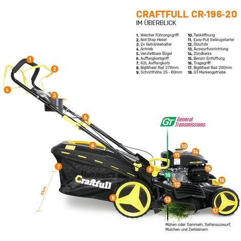 Als Profi Rasenmäher mit Radantrieb vereint der Craftfull Rasenmäher einen extra starken 196cc OHV Motor mit 4,4 KW (EURO 5) Leistung mit praktischen Features. Zum einen sorgt der Pullstart mit Easy Start Funktion für zügige Ergebnisse. Zum anderen garantieren die Big-Wheel Räder (270mm hinten, 200mm vorne) sowie 2 Getränkehalter am Griff für komfortable Handhabung des Benzin Rasenmähers. Craftfull – garantiert leichtgängige 5in1 Funktion für effiziente Gartenarbeit!