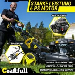 Als Profi Rasenmäher mit Radantrieb vereint der Craftfull Rasenmäher einen extra starken 224cc OHV Motor mit 5,2 KW (EURO 5) Leistung mit praktischen Features. Zum einen sorgt der Pullstart mit Easy Start Funktion für zügige Ergebnisse. Zum anderen garantieren die Big-Wheel Räder (254mm hinten, 182mm vorne) sowie 2 Getränkehalter am Griff für komfortable Handhabung des Benzin Rasenmähers. Craftfull – garantiert leichtgängige 5 in1 Funktion für effiziente Gartenarbeit!