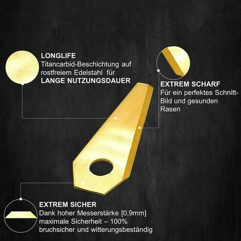 MATÉRIAU DE LAME HAUTE QUALITÉ – Nos lames de tondeuses robotisées sont fabriquées en acier inoxydable et traitées lors d’une étape de fabrication supplémentaire. En combinaison avec le revêtement en carbure de titane et l’épaisseur de la feuille de 1 mm, on obtient une lame extrêmement durable et résistante aux ruptures !