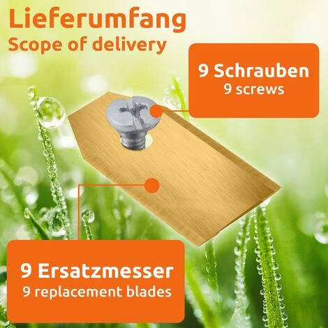 ERSATZKLINGEN SET: Sie bekommen ein vollständiges Set aus 9 Ersatzklingen inkl. der benötigten Befestigungsschrauben. Wir empfehlen, den Messersatz immer vollständig zu wechseln für ein gleichmäßiges Mähergebnis.