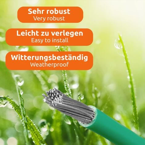 Mit diesem witterungsbeständigen Begrenzungskabel können Sie die zu mähende Fläche ganz einfach abstecken. Das Kabel lässt sich sehr leicht abwickeln und um die abgesteckte Fläche legen. So gelingt es dem Roboter sehr präzise, auch um schwierige Ecken und Kanten zu manövrieren. Es dient in dieser Funktion auch als Suchkabel und als Führungskabel, mit dessen Hilfe der Roboter um schwierige Ecken und Kanten herumfahren kann. Das Ergebnis: Sie haben einen präzise und sauber gemähten Rasen.