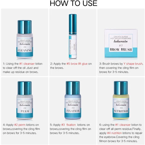 Lieferumfang: 1 x Frischhaltefolie 1 x Bürste zum Anheben der Brauen 1 x Reinigungsmittel 1 x Lotion für die Dauerwelle 1 x Fixierlotion 1 x Nährlotion 1 x Kleber zum Anheben der Brauen Tragen Sie Nr. 5 Brow Lift Kleber auf die Brauen auf 3: Bürsten Sie die Brauen mit einer Y-förmigen Bürste und bedecken Sie sie dann mit der Frischhaltefolie 4: Tragen Sie Nr. 2 Dauerwellenlotion auf und bedecken Sie sie mit der Frischhaltefolie ca. 3-5 Minuten Lotion, ca. 3-5 Minuten mit Frischhaltefolie abdecken 6: Verwenden Sie Nr. 1 Reiniger, um alle Rückstände der Dauerwelle zu entfernen 7: Verwenden Sie zum Schluss Nr. 4 Nutrition, um die Augenbraue zu reparieren, und bedecken Sie sie ca. 3-5 Minuten mit Frischhaltefolie